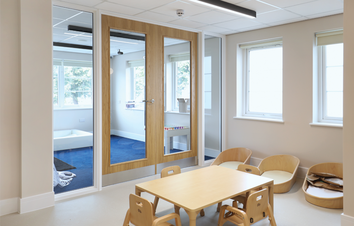Lloyd Worrall provided lacquered oak veneer doorsets for the circulation doors. Known for their durability and easy to clean properties, a range of laminate faced doorsets in deep, rich colours of blue, red, green and yellow, were supplied to each of the development stage rooms, creating a welcoming and warm environment whilst subtly introducing primary colours into the space.